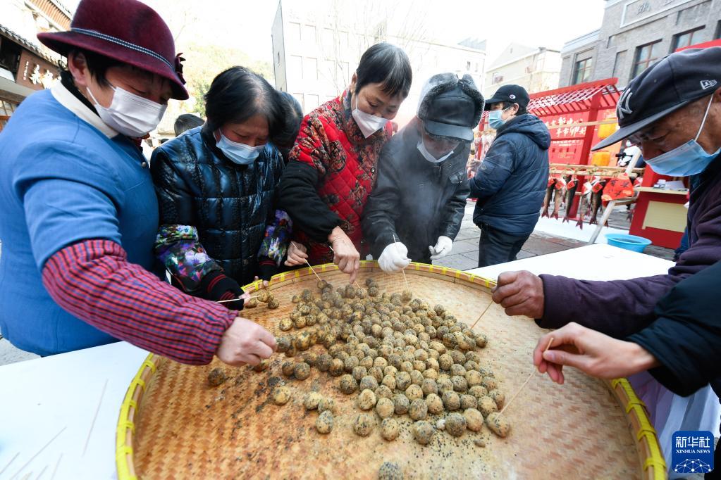 1月11日,人們在杭州市余杭區瓶窯鎮瓶窯老街年貨節上品嘗特色小吃。