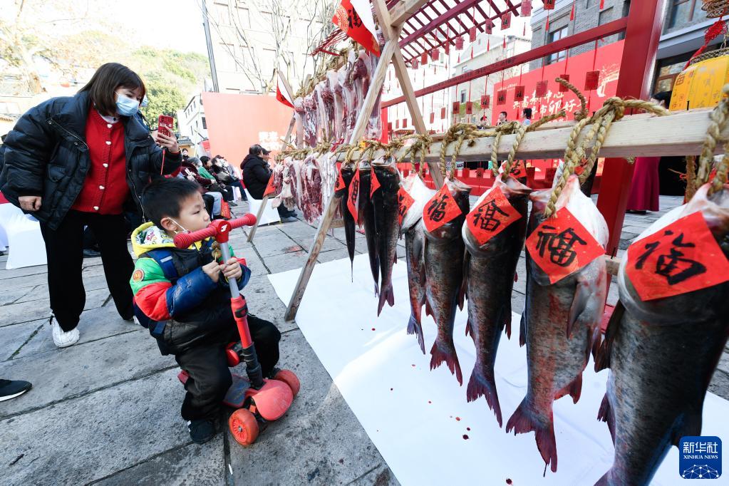 這是杭州市余杭區瓶窯鎮瓶窯老街年貨節上展示的鰱魚(yú)、土豬肉等特色年貨(1月11日攝)。
