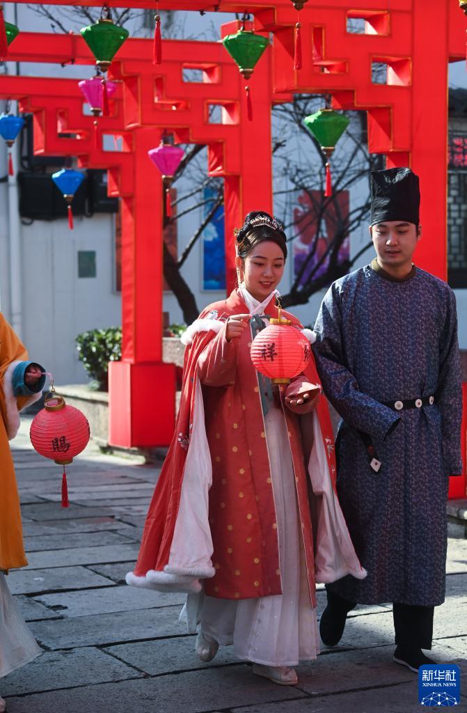 1月11日,人們在杭州市余杭區瓶窯鎮瓶窯老街年貨節上身著(zhù)傳統服飾體驗傳統民俗。