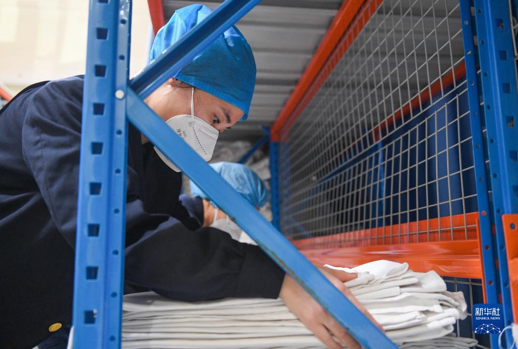 1月10日,工作人員在洗滌車(chē)間整理清洗干凈的臥具。