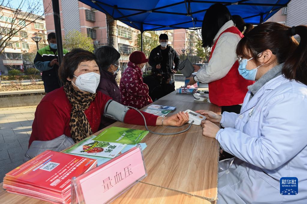 1月11日,在嘉興市南湖區余新鎮幸福社區,衛生院的醫生和志愿者為百姓開(kāi)展義診、健康防護微宣講等活動(dòng)。