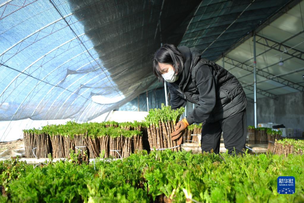 1月9日,在新民市大民屯鎮毓寶臺村大棚里,農民將一捆刺嫩芽放到培育池內。