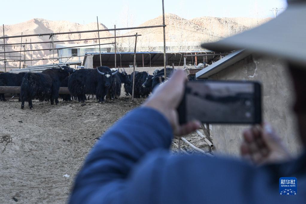1月9日,孫海云用手機拍攝牛圈內的牦牛。