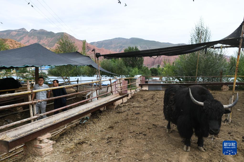 孫海云(右)向青海聯(lián)通技術(shù)人員介紹牛圈情況(2021年7月15日攝)。