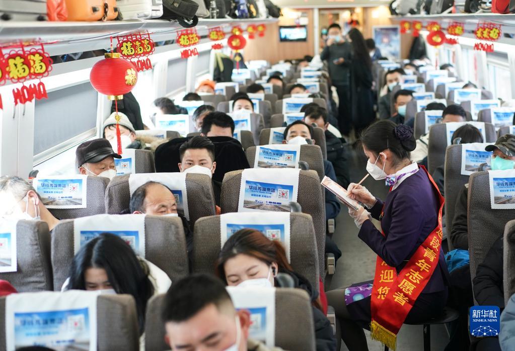 當日,中國鐵路上海局集團有限公司南京客運段高鐵二車(chē)隊在D376次列車(chē)上開(kāi)展“回家路上的笑容”繪畫(huà)活動(dòng),列車(chē)員現場(chǎng)為旅客作畫(huà),送上新年祝福。