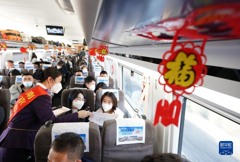 當日,中國鐵路上海局集團有限公司南京客運段高鐵二車(chē)隊在D376次列車(chē)上開(kāi)展“回家路上的笑容”繪畫(huà)活動(dòng),列車(chē)員現場(chǎng)為旅客作畫(huà),送上新年祝福。