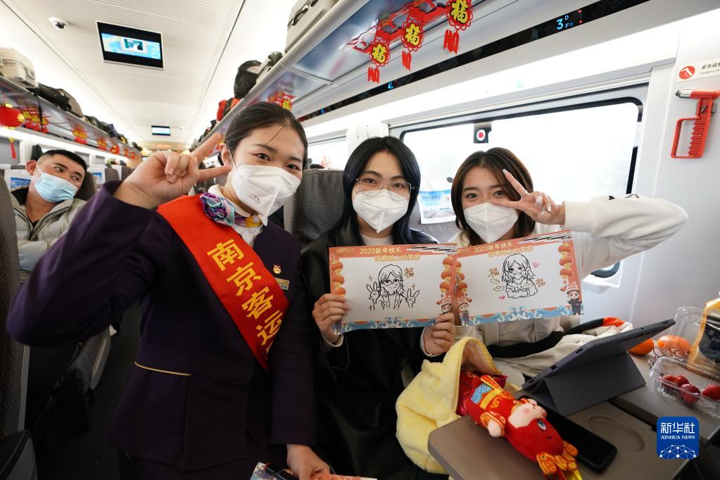 當日,中國鐵路上海局集團有限公司南京客運段高鐵二車(chē)隊在D376次列車(chē)上開(kāi)展“回家路上的笑容”繪畫(huà)活動(dòng),列車(chē)員現場(chǎng)為旅客作畫(huà),送上新年祝福。
