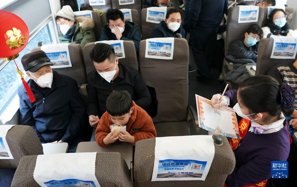 當日,中國鐵路上海局集團有限公司南京客運段高鐵二車(chē)隊在D376次列車(chē)上開(kāi)展“回家路上的笑容”繪畫(huà)活動(dòng),列車(chē)員現場(chǎng)為旅客作畫(huà),送上新年祝福。