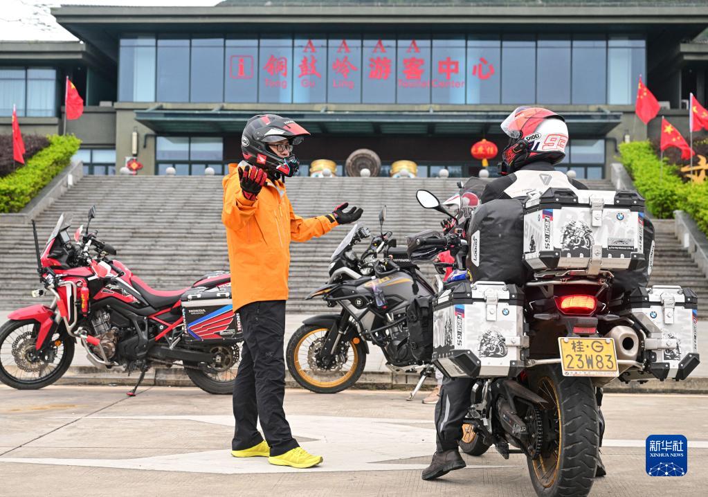 幾名騎行而來(lái)的游客在海南文昌銅鼓嶺景區交流(2022年12月28日攝)。
