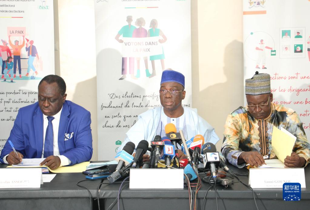 1月11日,貝寧全國選舉自治委員會(huì )主席薩卡·拉菲亞(中)在科托努公布國民議會(huì )選舉初步結果。