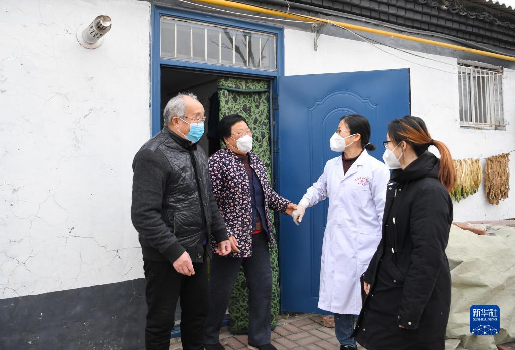 1月11日,河北省唐山市豐南區嶺子上村“農村巡診小分隊”村醫董秀芹(右二)和網(wǎng)格員楊順利(右一)和村民話(huà)別。