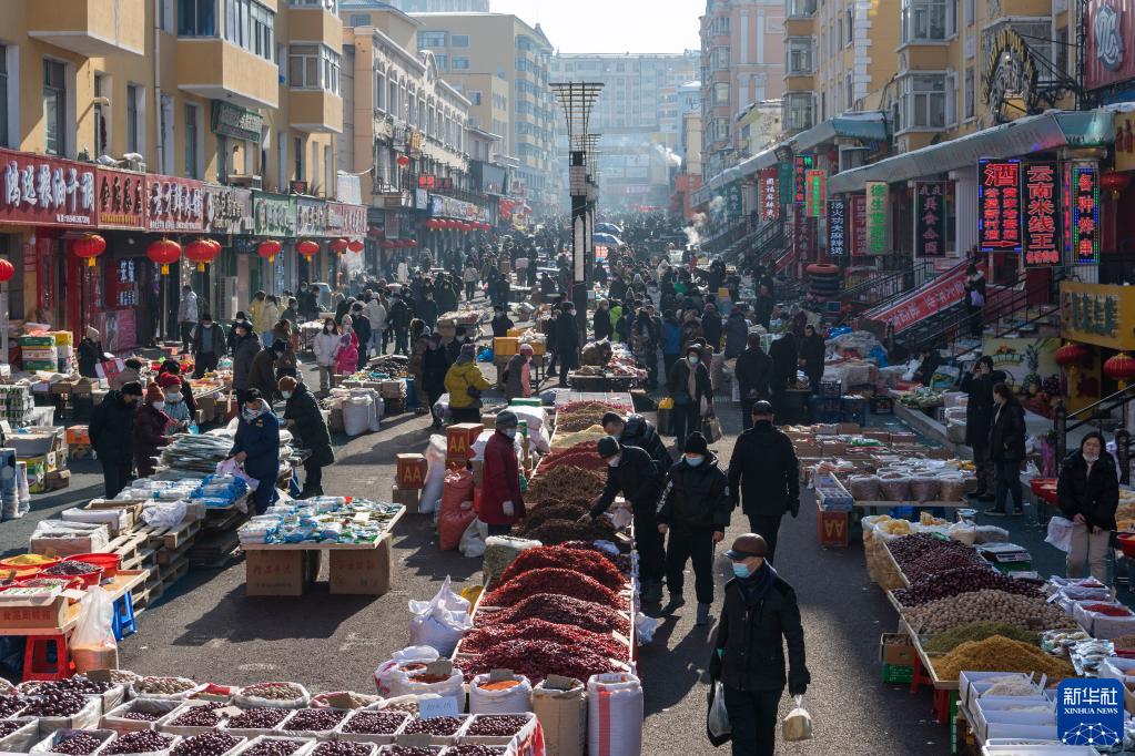 春節臨近,黑龍江省綏芬河市龍須溝步行街的年貨大集十分熱鬧。不少市民前來(lái)選購年貨,迎接新春的到來(lái)。