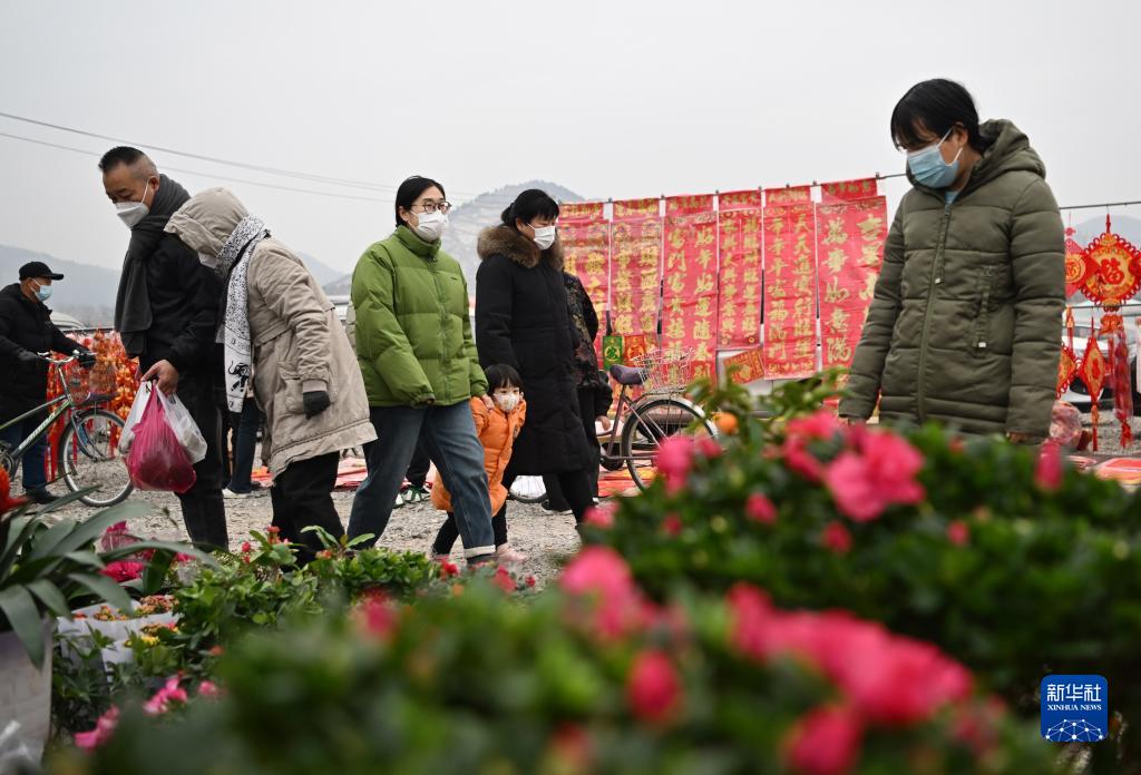 1月12日,前來(lái)趕集的居民在西路莊大集上挑選花卉。