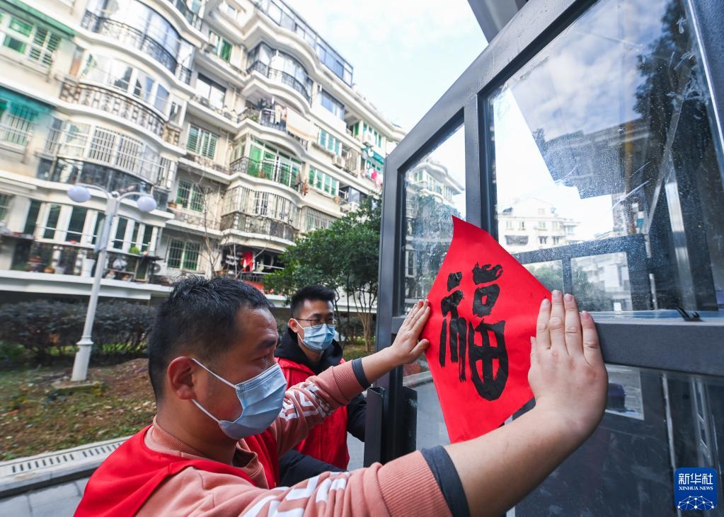1月12日,在飛英街道竹翠園社區新世紀花苑小區,志愿者在小區樓道門(mén)上貼福字。