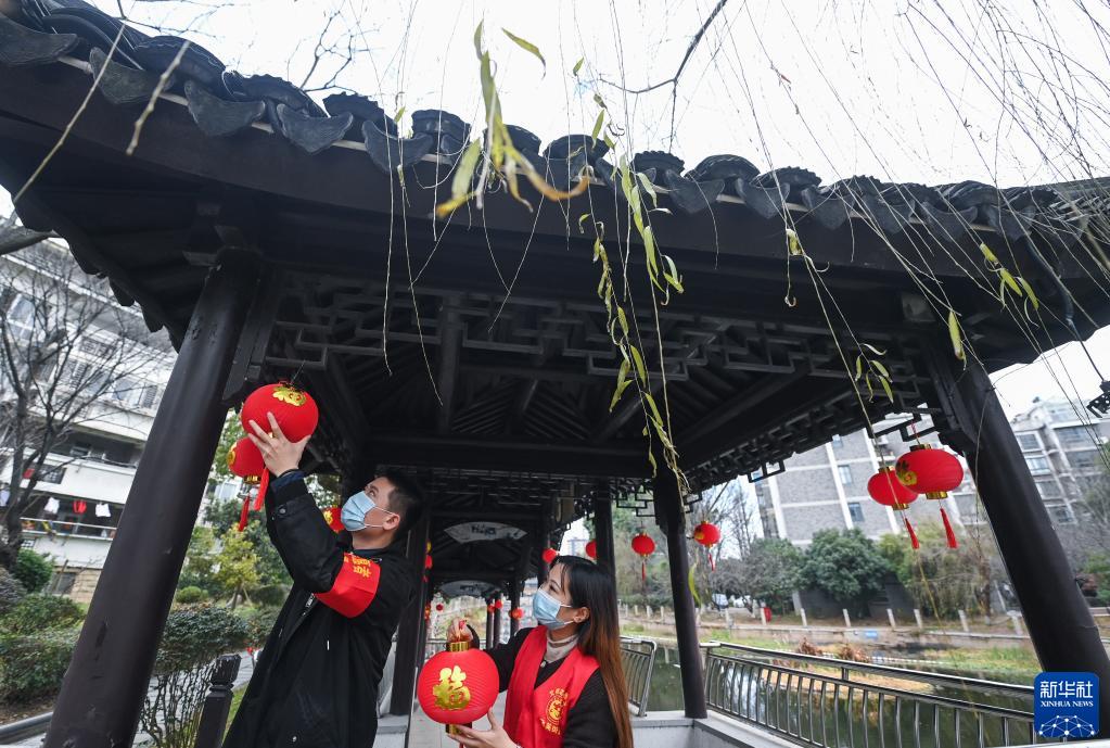 1月12日,在飛英街道河畔居小區,志愿者掛上節日的燈籠。