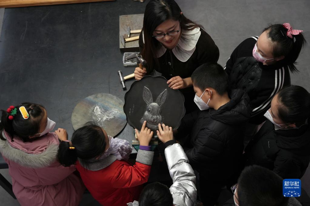 1月12日,在石家莊市新華區一個(gè)文化工作室,一名鐵板浮雕藝人向小朋友展示生肖兔作品。