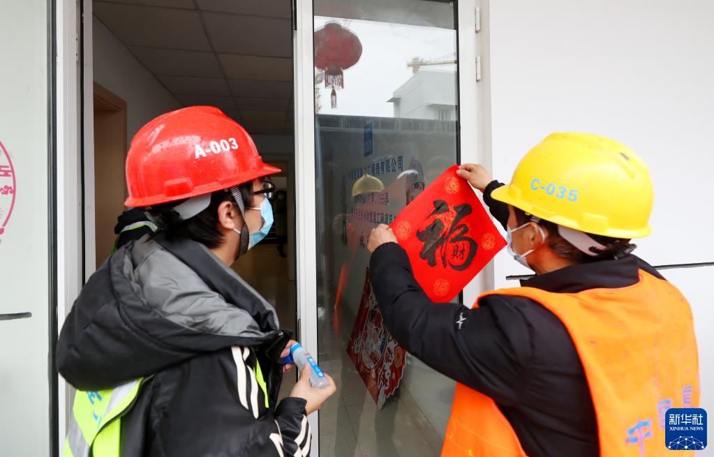 1月13日,工友在談家橋項目工地辦公室門(mén)上貼福字。