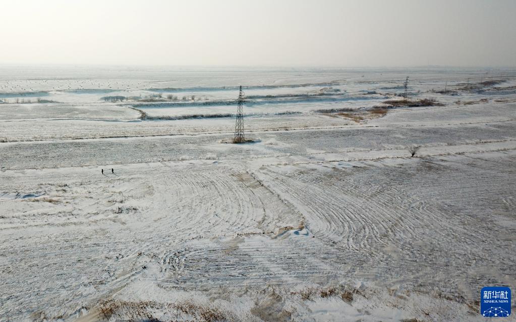 1月12日,國網(wǎng)撫遠市供電分公司抓吉供電所所長(cháng)白樺先和工友費義偉在巡視東極線(xiàn)的路上(無(wú)人機照片)。