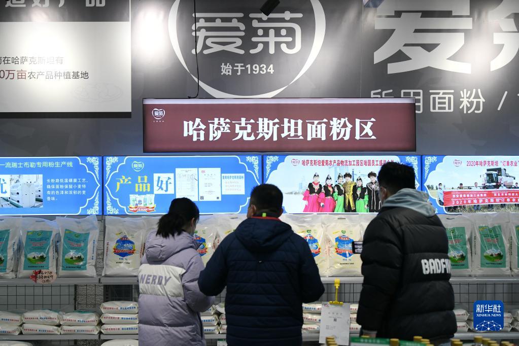 1月13日,在位于西安國際港務(wù)區的愛(ài)菊健康生活體驗館,消費者挑選哈薩克斯坦面粉產(chǎn)品。
