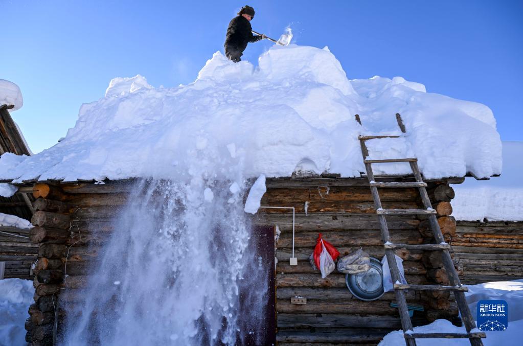 新疆阿勒泰地區禾木村村民木拉提·哈森張在清理小木屋頂積雪(1月12日攝)。他已將自家的10間房屋租給景區商戶(hù)開(kāi)辦民宿。