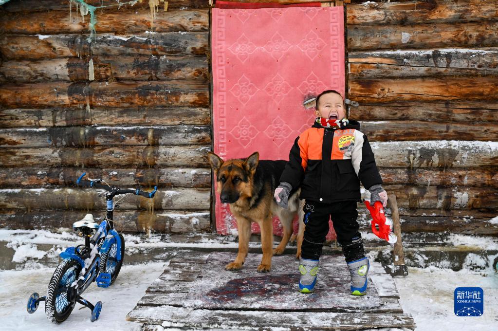 家住新疆阿勒泰地區禾木村的小朋友其力格爾在小木屋前玩耍(1月11日攝)。