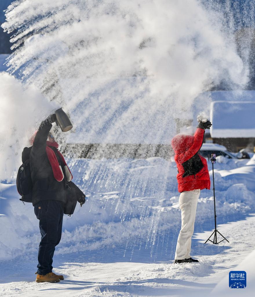 在新疆阿勒泰地區,當日最低氣溫降至零下37攝氏度,游客體驗“潑水成冰”并進(jìn)行網(wǎng)絡(luò )直播(1月12日攝)。
