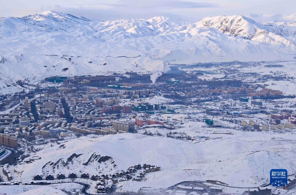 雪山腳下的新疆阿勒泰市城區(2022年12月30日攝)。