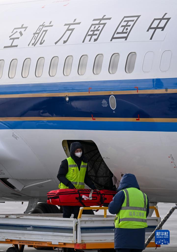 由廣州直飛新疆阿勒泰市的航班降落后,阿勒泰機場(chǎng)工作人員在搬運乘客的滑雪板等行李(2022年12月30日攝)。該航班大部分乘客為雪友。為促進(jìn)冬季旅游,阿勒泰聯(lián)合廣州、成都等地開(kāi)通多條直飛“冰雪旅游航線(xiàn)”。