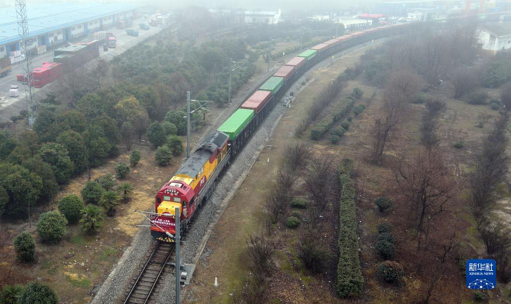 1月13日,2023年合肥開(kāi)往上海的首趟海鐵聯(lián)運班列從合肥北站物流基地駛出(無(wú)人機照片)。