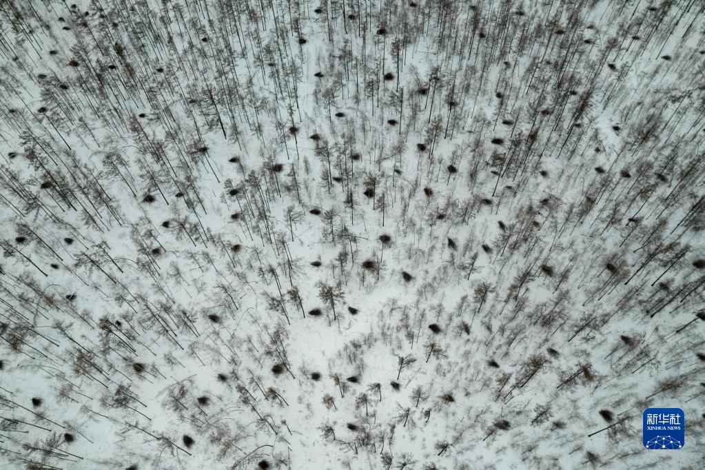 這是1月11日拍攝的漠河林場(chǎng)撫育作業(yè)點(diǎn)已經(jīng)完成林間清理作業(yè)的樹(shù)枝堆(無(wú)人機照片)。