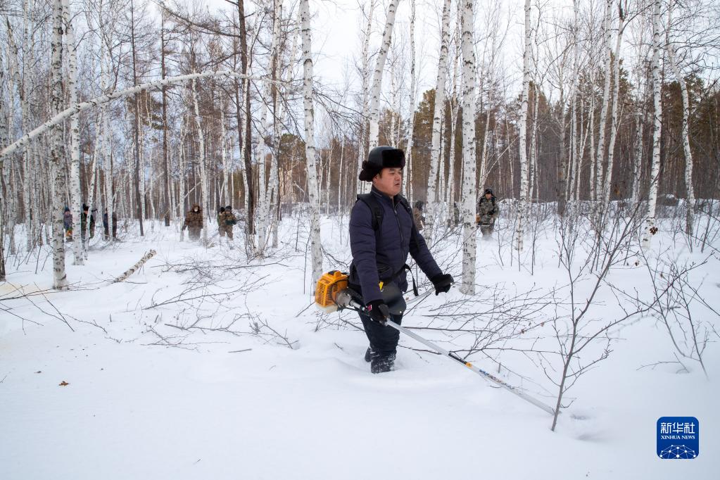 1月11日,在漠河林場(chǎng)管護區作業(yè)點(diǎn),割灌機手齊勇剛在進(jìn)行林間清理作業(yè)。