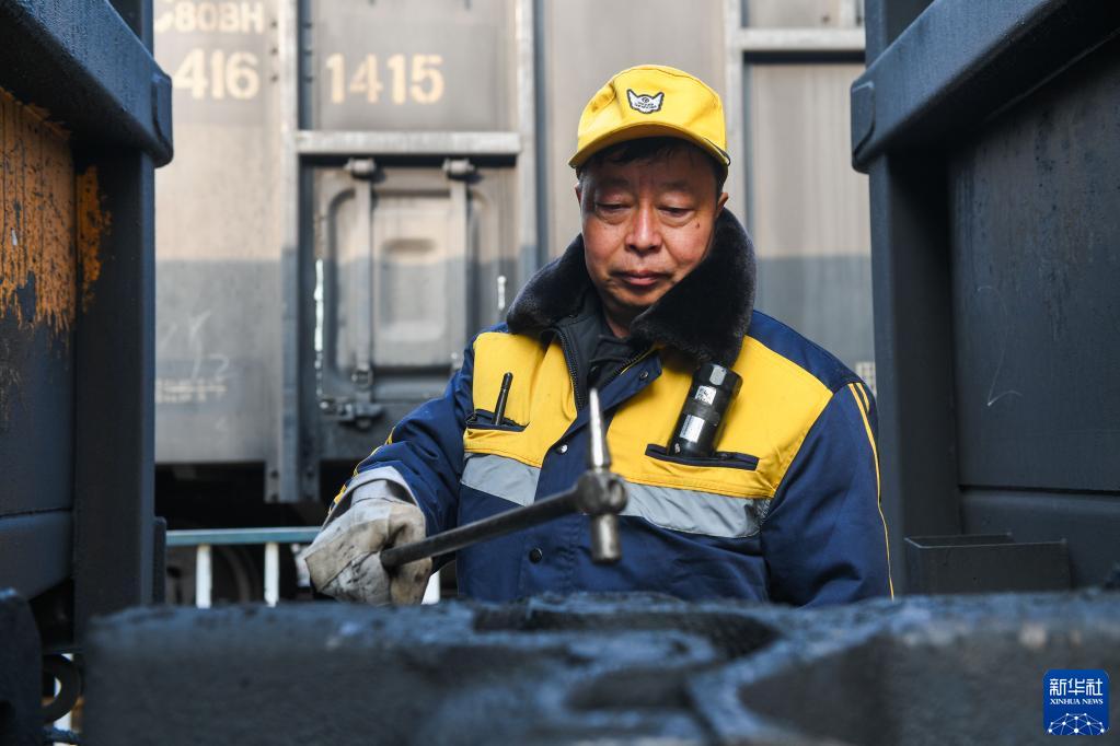 1月12日,吉海清在用檢點(diǎn)錘為萬(wàn)噸大列進(jìn)行敲擊檢查。新華社記者 劉磊 攝