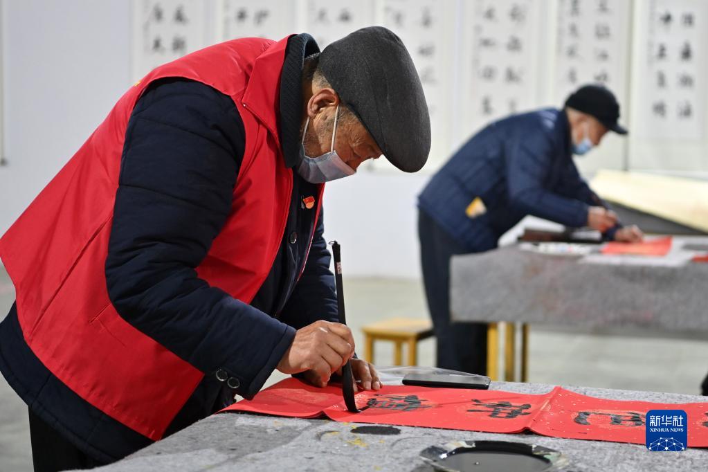 1月13日,寺底村村民在書(shū)寫(xiě)春聯(lián)。