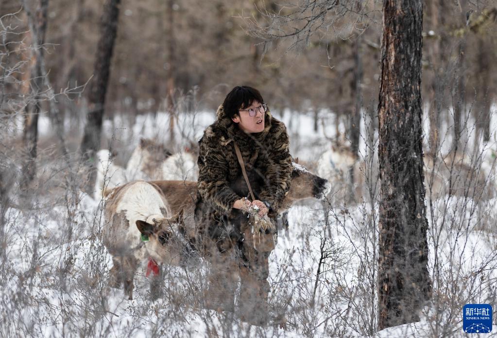 1月12日,覺(jué)樂(lè )用雪洗手,消除手上的異味,準備給鹿群喂一些豆餅。馴鹿對氣味非常敏感。新華社記者 費茂華 攝