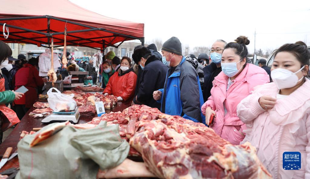 1月12日,市民在蒲河大集上挑選采購鮮驢肉。