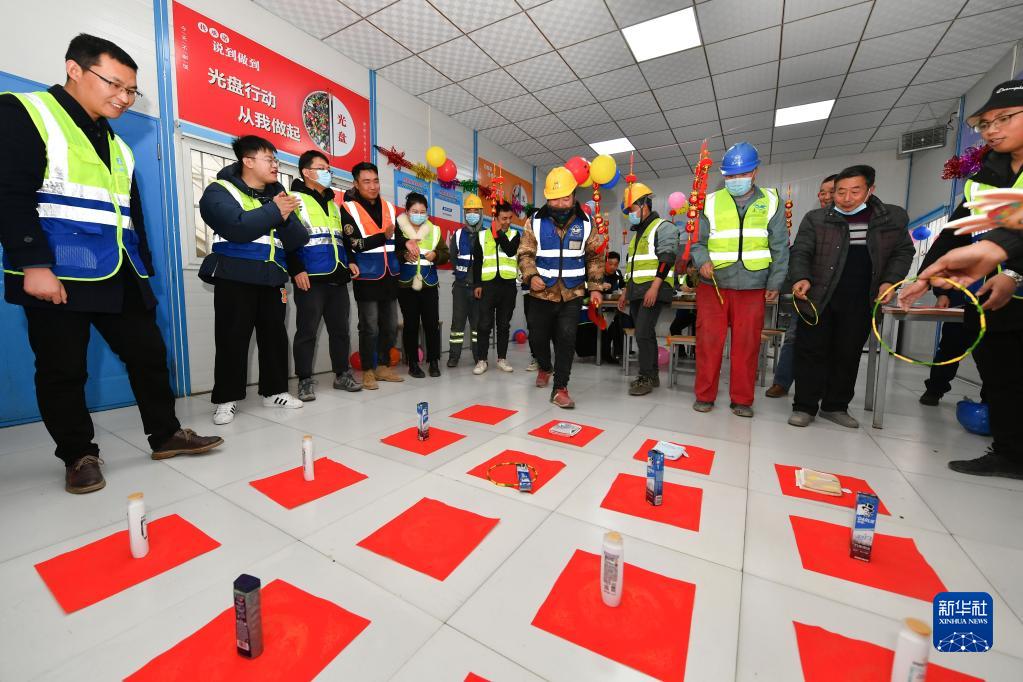 1月13日,在位于陜西省西安市的陜西師范大學(xué)體育訓練中心建設項目現場(chǎng),中建三局西北公司項目管理人員與工人進(jìn)行游戲互動(dòng)。