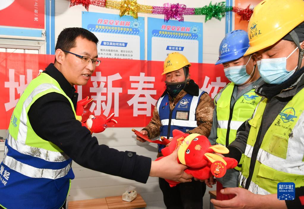 1月13日,在位于陜西省西安市的陜西師范大學(xué)體育訓練中心建設項目現場(chǎng),中建三局西北公司項目管理人員(左)向工人發(fā)放兔年紀念品。