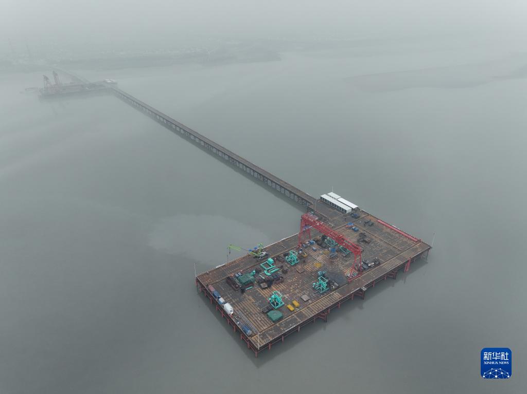 1月13日拍攝的張靖皋長(cháng)江大橋南航道橋南主塔施工現場(chǎng)(無(wú)人機照片)。