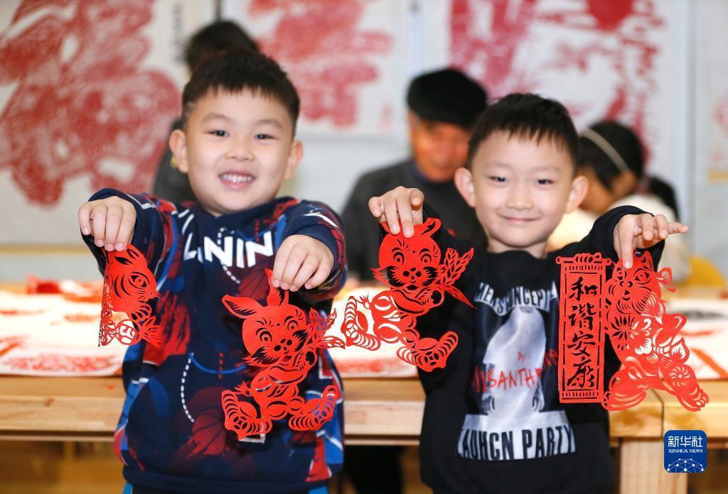1月13日,山東省青島市即墨區龍山街道兩名小朋友在展示兔子圖案的剪紙作品。
