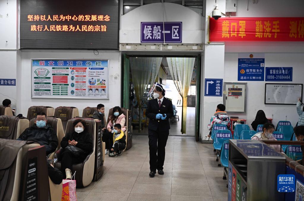 在廣東徐聞的粵海鐵路輪渡北港碼頭客運樓,肖玉鳳(中)在候船大廳巡視(1月8日攝)。