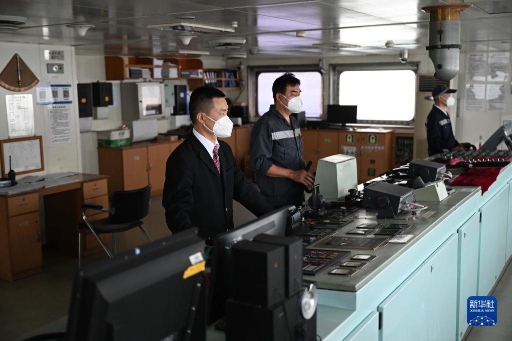 在粵海鐵路輪渡上,李雄(左)在航行中操作設備(1月9日攝)。