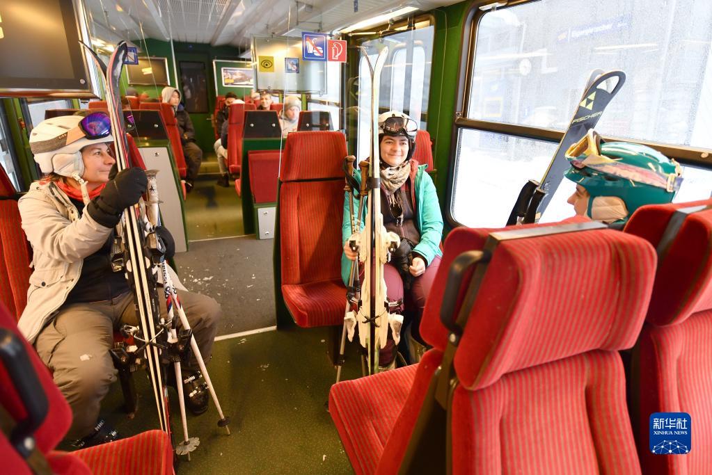 1月12日,在瑞士少女峰,滑雪好者乘坐火車(chē)下山。