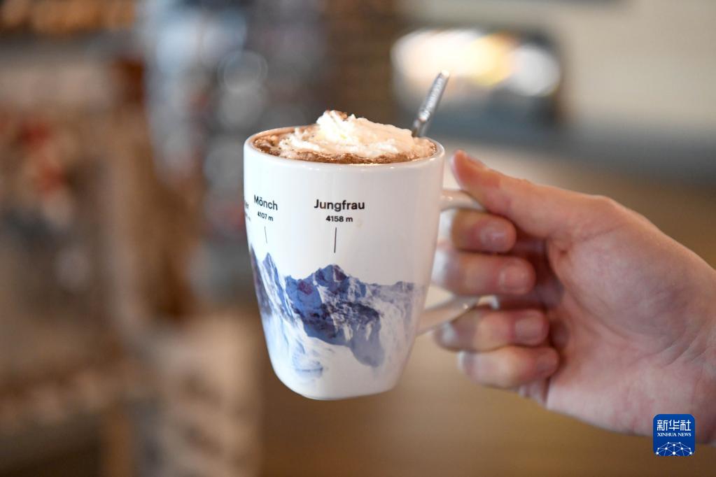 1月12日,一名游客在瑞士少女峰滑雪場(chǎng)的咖啡店里展示印有少女峰圖案的咖啡杯。