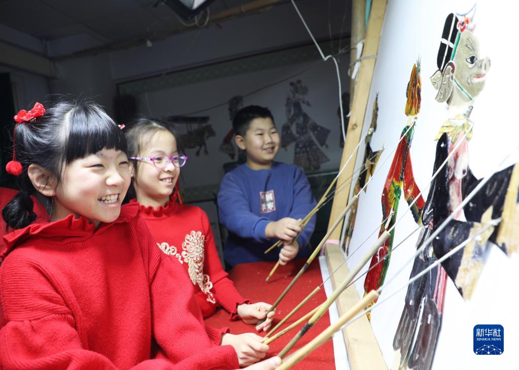 1月13日,在唐山市豐潤區文化館,小朋友在表演皮影戲。