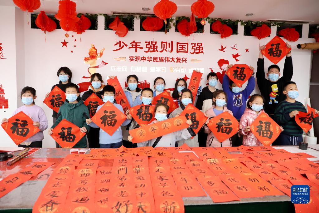 1月13日,山東省青島西海岸新區青少年展示書(shū)寫(xiě)的春聯(lián)。