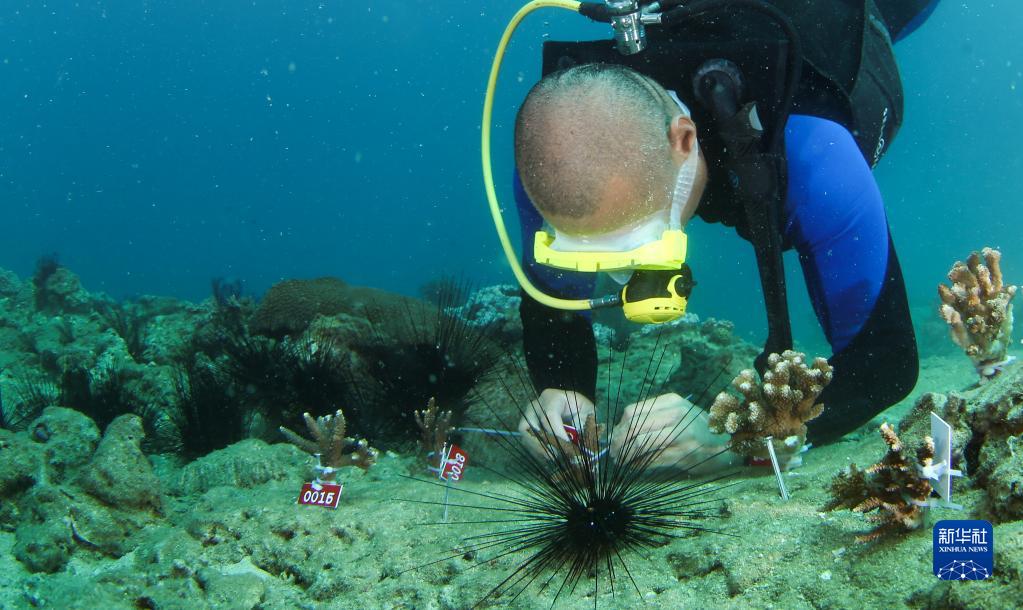 在海南省三亞市亞龍灣相關(guān)海域,潛水員在海底移植珊瑚(2022年11月17日攝)。