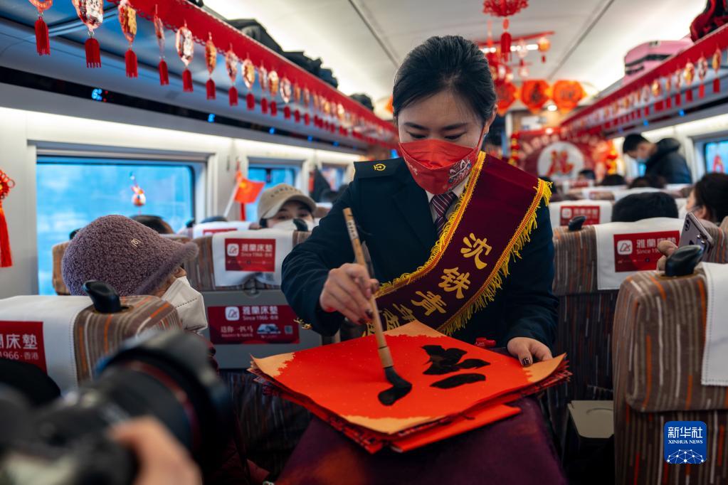 1月13日,列車(chē)乘務(wù)人員為旅客寫(xiě)福字。