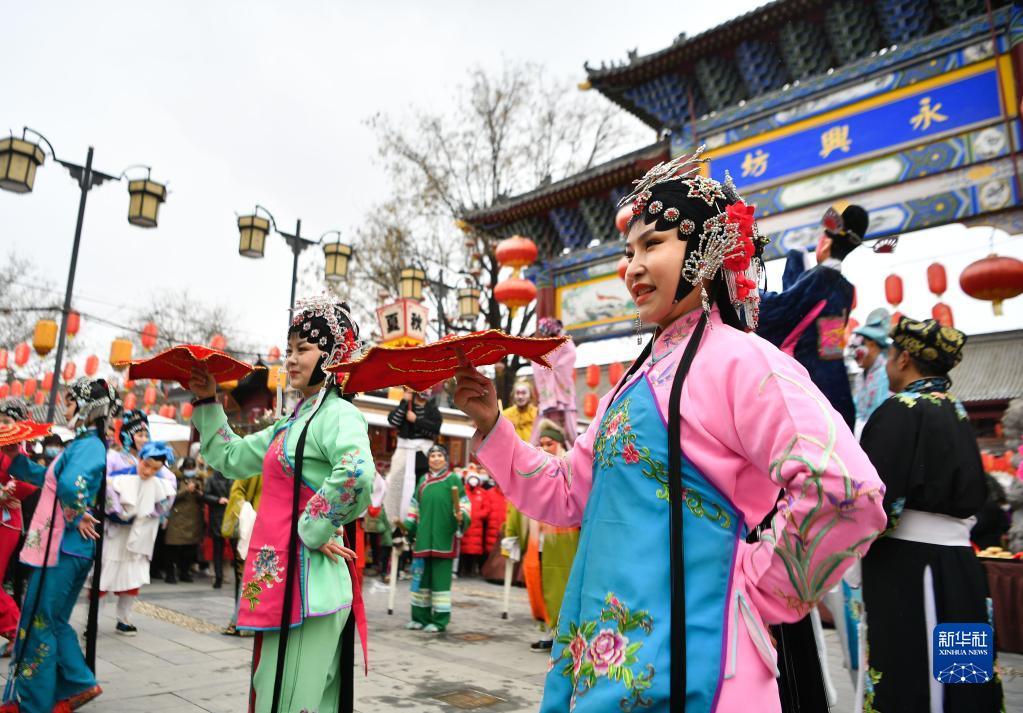 1月14日,演員在西安市永興坊景區表演傳統社火。