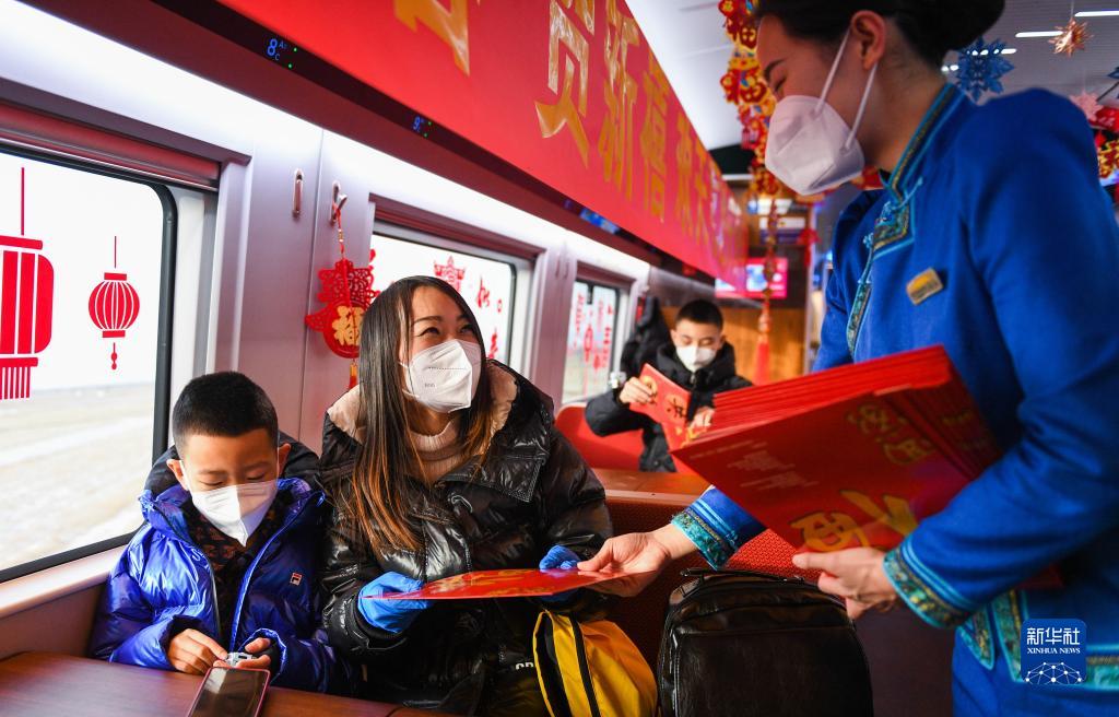當日正值北方小年,北京開(kāi)往呼和浩特的G2457次復興號列車(chē)被乘務(wù)員們布置得喜氣洋洋。高鐵乘務(wù)員和鐵路烏蘭牧騎隊員們,不僅為旅客奉上一臺精彩演出,還準備了豐富的節日禮品,一路歡聲笑語(yǔ)伴隨著(zhù)乘客。