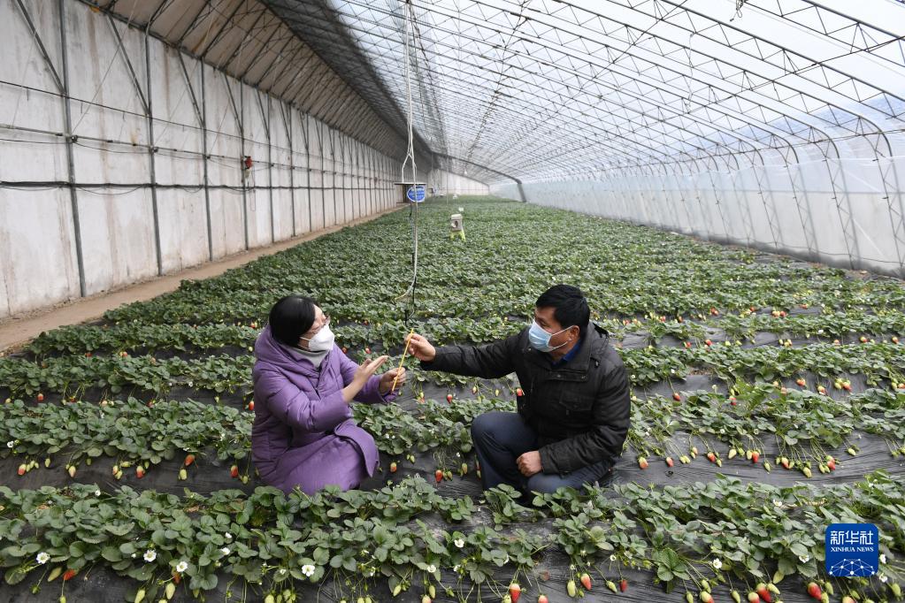 1月14日,唐山市豐潤區農業(yè)農村局高級農藝師劉新紅(左)在豐潤區燕灃園生態(tài)農場(chǎng)一個(gè)草莓大棚為農民講解防寒潮注意事項。